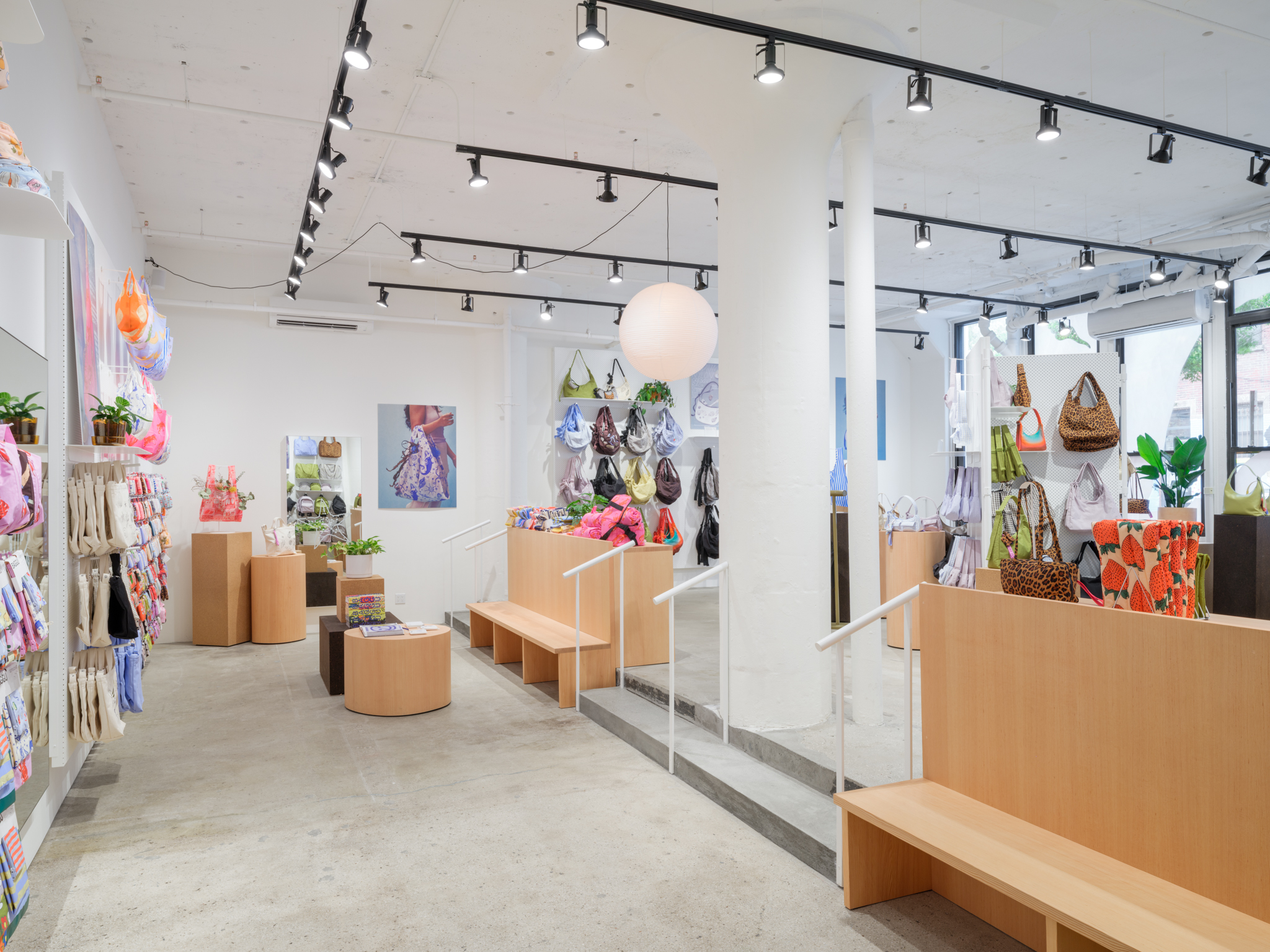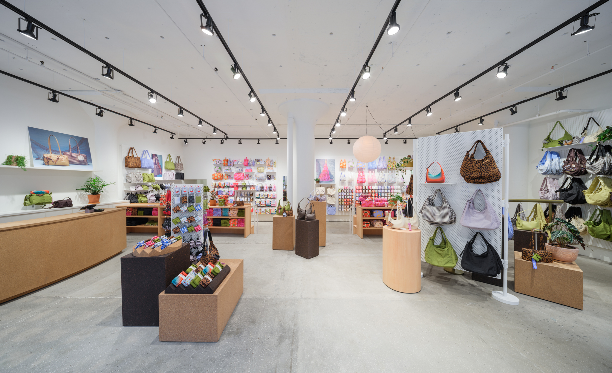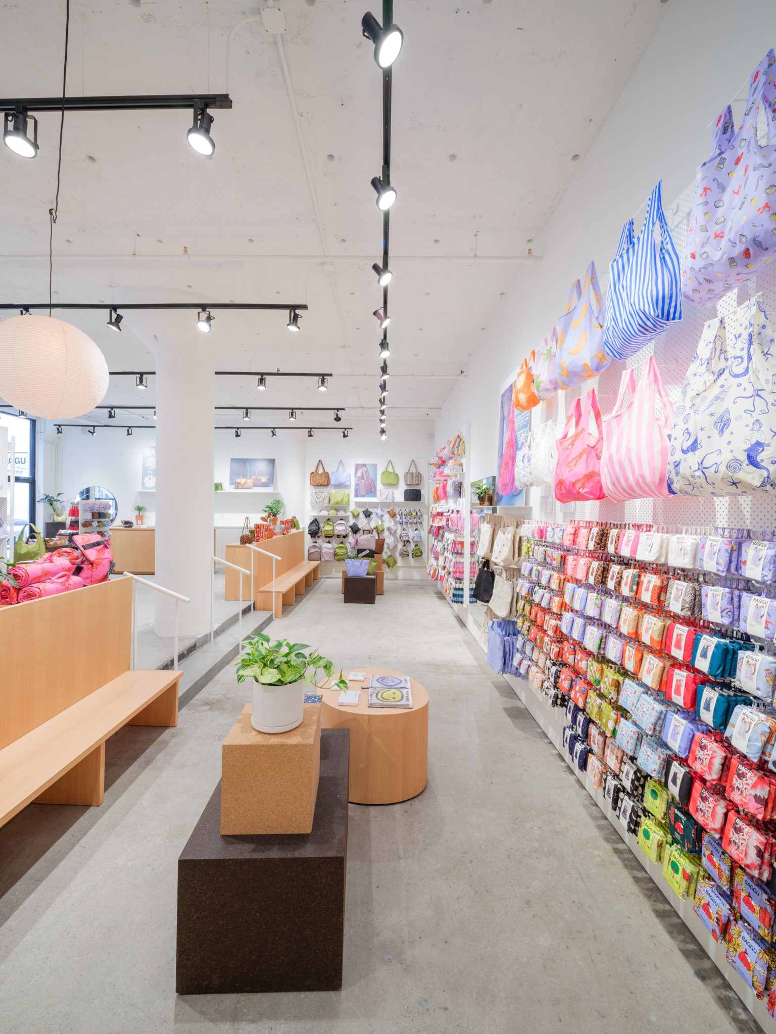 The space favors natural sustainable materials and draws references from the studio spaces of Constantin Brâncuși and Isamu Noguchi. New concrete floors and white painted brick walls are inhabited by various cork displays, fuzzy seating, wavy hanging rails and wooden block pedestals, underneath skylights and simple black track lights, forming a re-arrangeable gallery of sorts where the layout can update along with seasons. BAGGU’s expanding collections of bags and accessories for everyday living are playfully displayed about the store alongside plants, art and paper lamps, for an inviting space that’s part loft interior and part soho gallery.