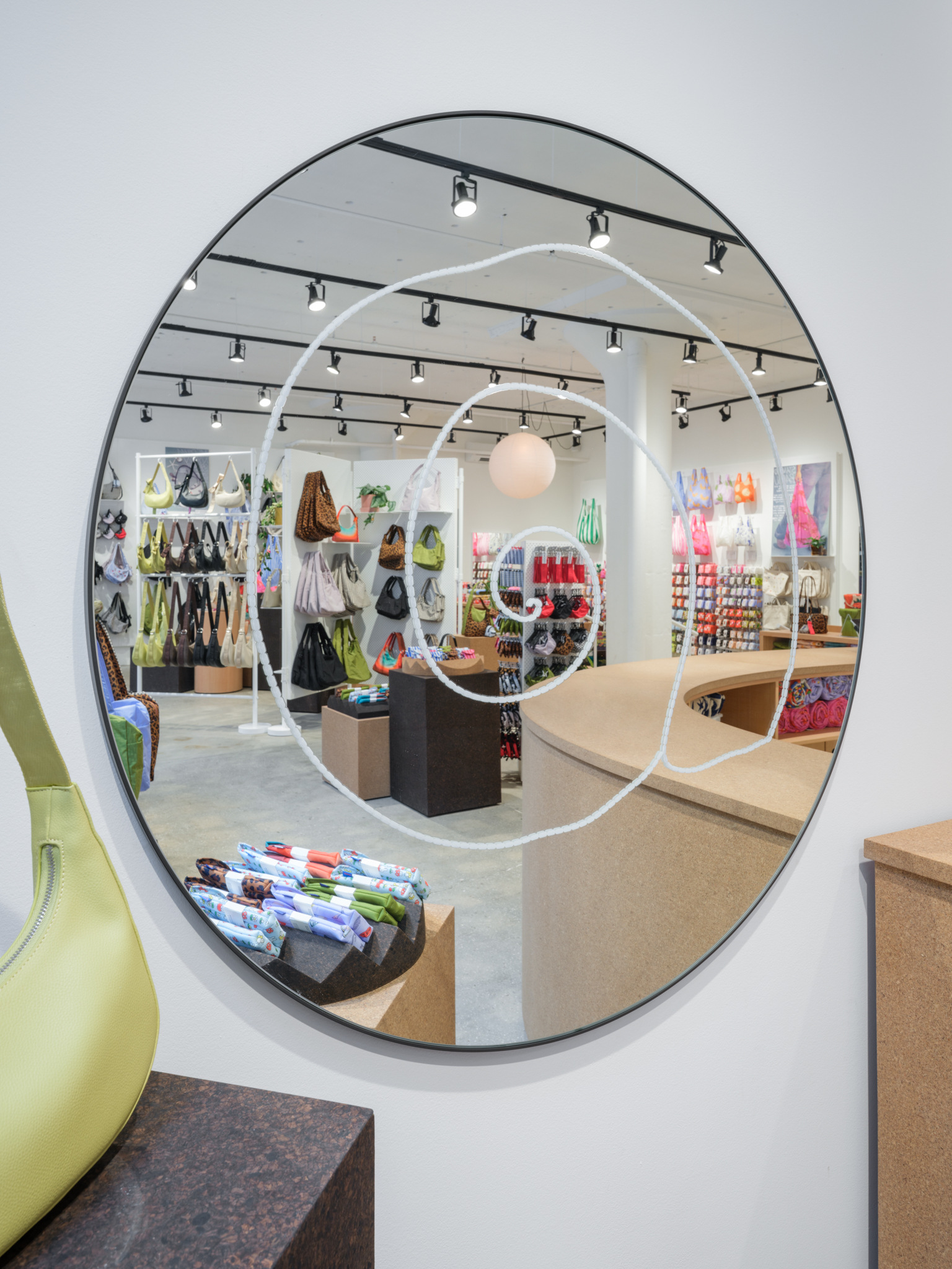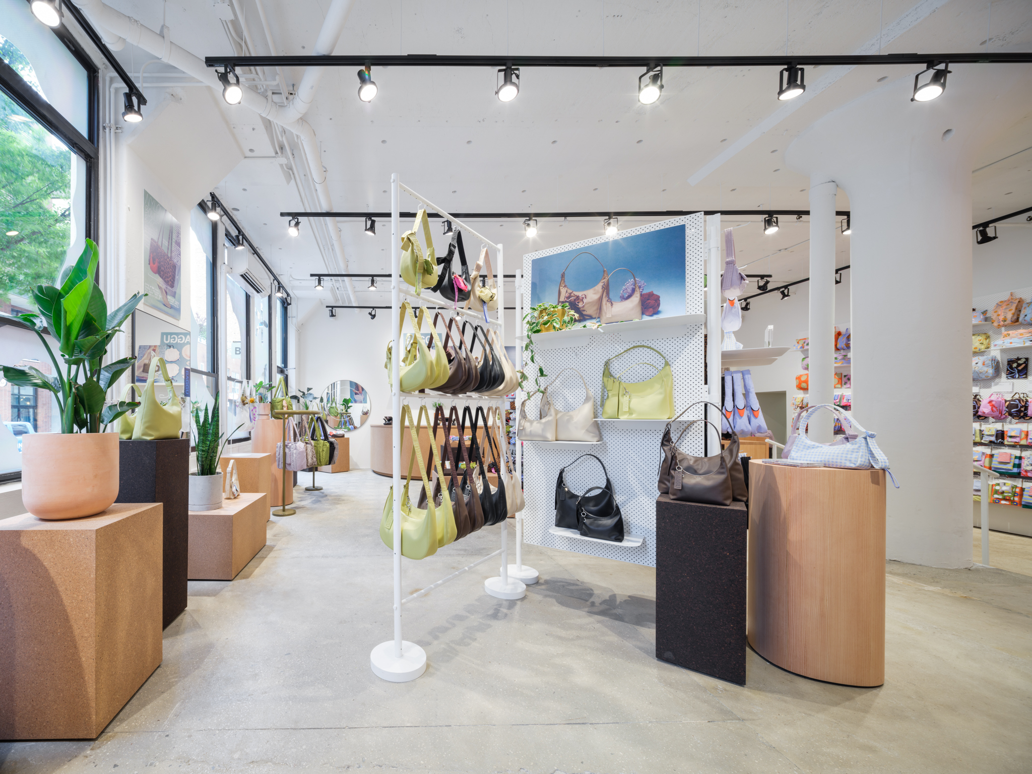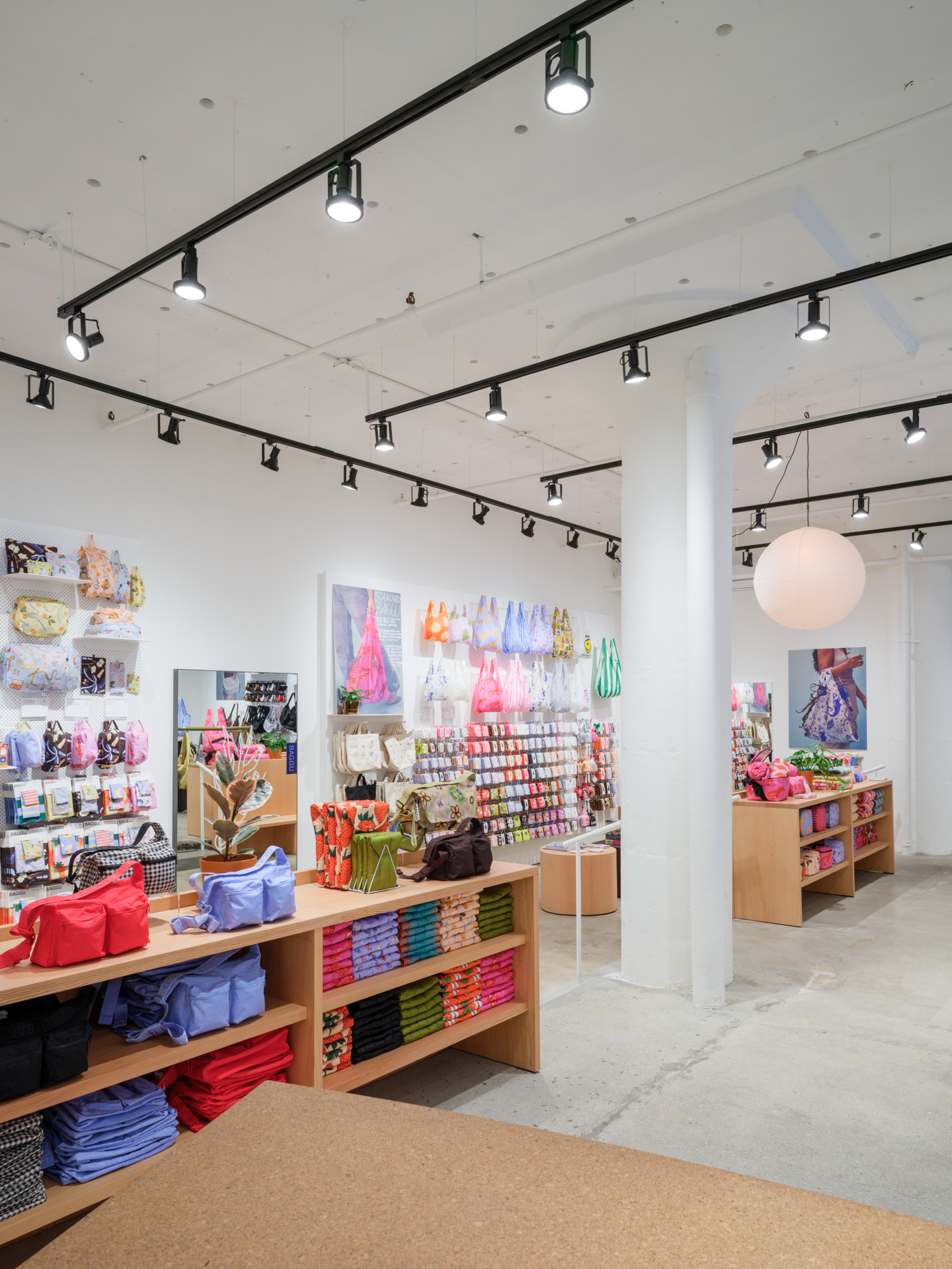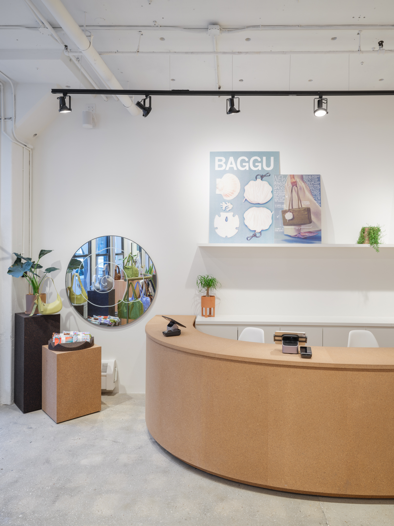 The space favors natural sustainable materials and draws references from the studio spaces of Constantin Brâncuși and Isamu Noguchi. New concrete floors and white painted brick walls are inhabited by various cork displays, fuzzy seating, wavy hanging rails and wooden block pedestals, underneath skylights and simple black track lights, forming a re-arrangeable gallery of sorts where the layout can update along with seasons. BAGGU’s expanding collections of bags and accessories for everyday living are playfully displayed about the store alongside plants, art and paper lamps, for an inviting space that’s part loft interior and part soho gallery.