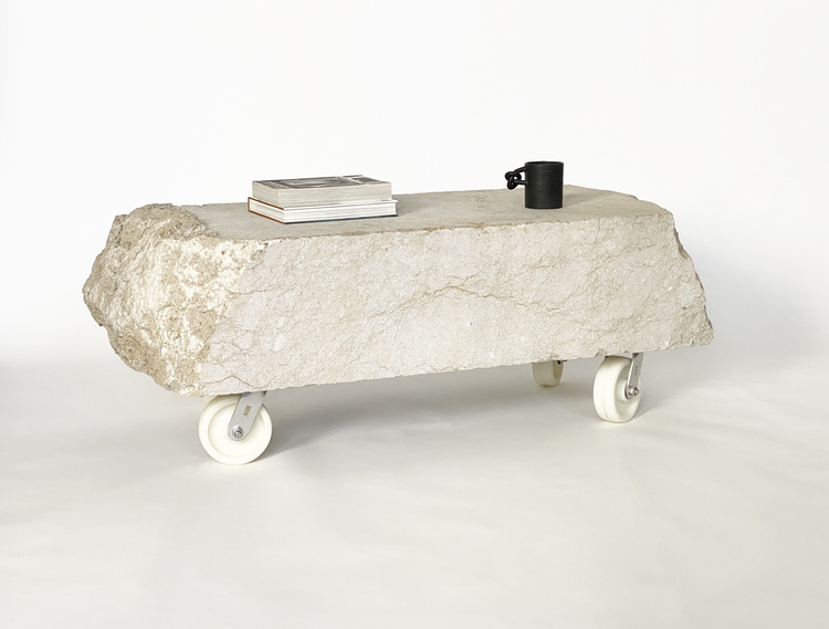 A half ton block of limestone floats above the ground with a massive presence, yet is surprisingly maneuverable resting on the essential and whimsical wheels below. The smooth block surfaces end off with natural break faces, revealing the raw materiality of the stone to bring a rough yet elegant chunk of nature indoors.