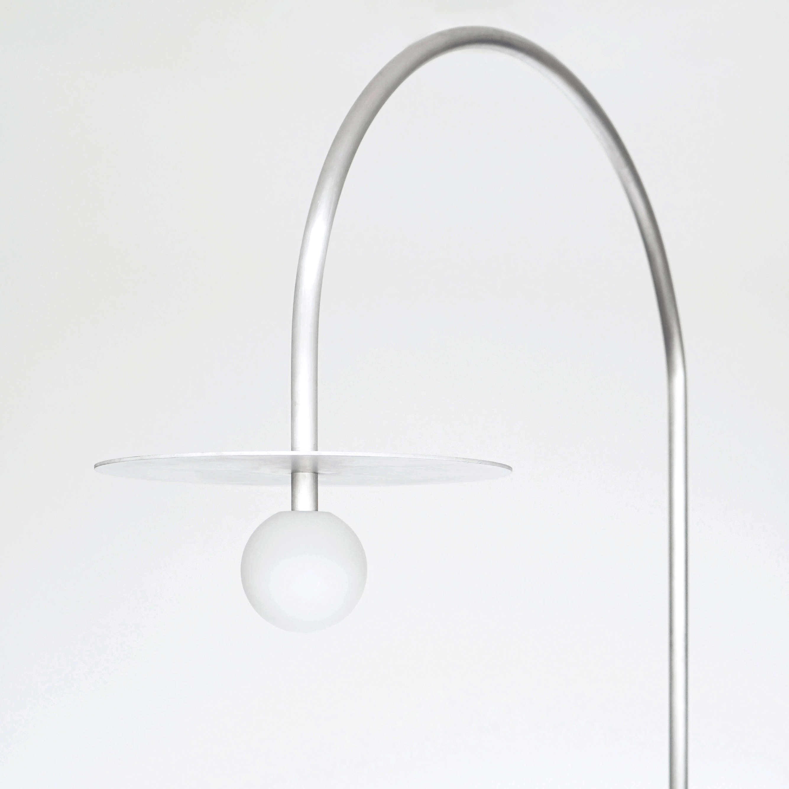 The cane shaped pole ends with a circle light shield just above a matte white ball light. The black fabric cord runs in a groove under the stone, laying about a space as part of the piece.